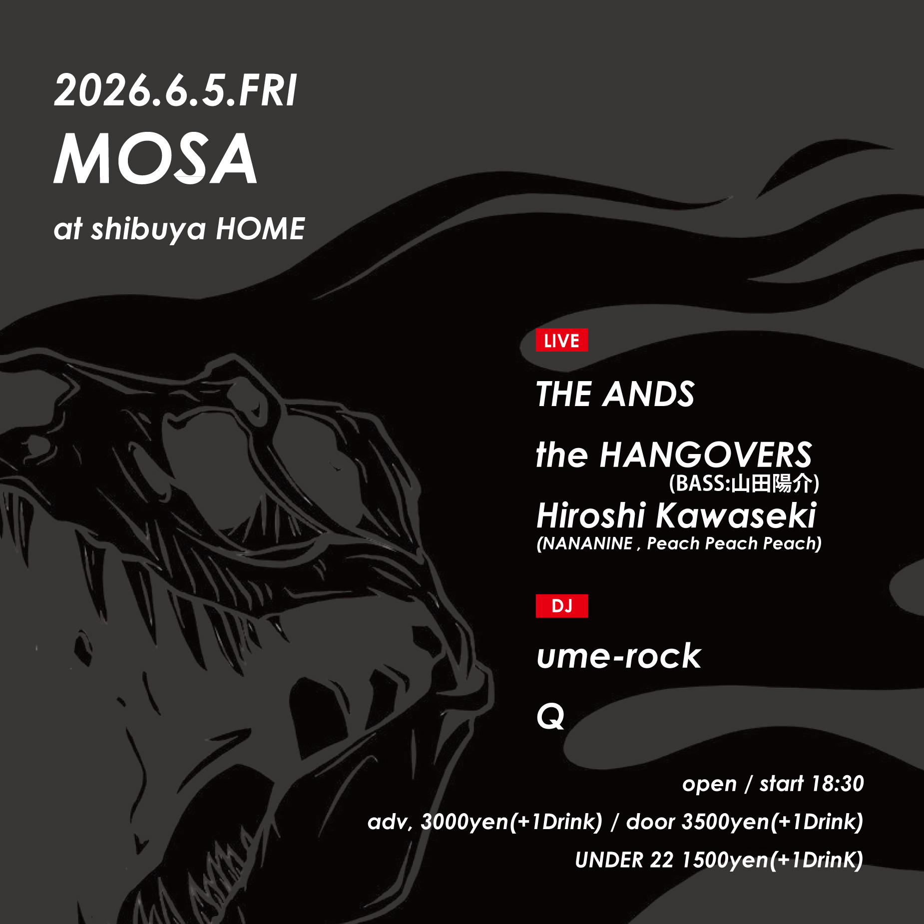 Adv,¥3000(+1drink) / door ¥3500(+1drink) / U22 ¥1500(+1Drink)